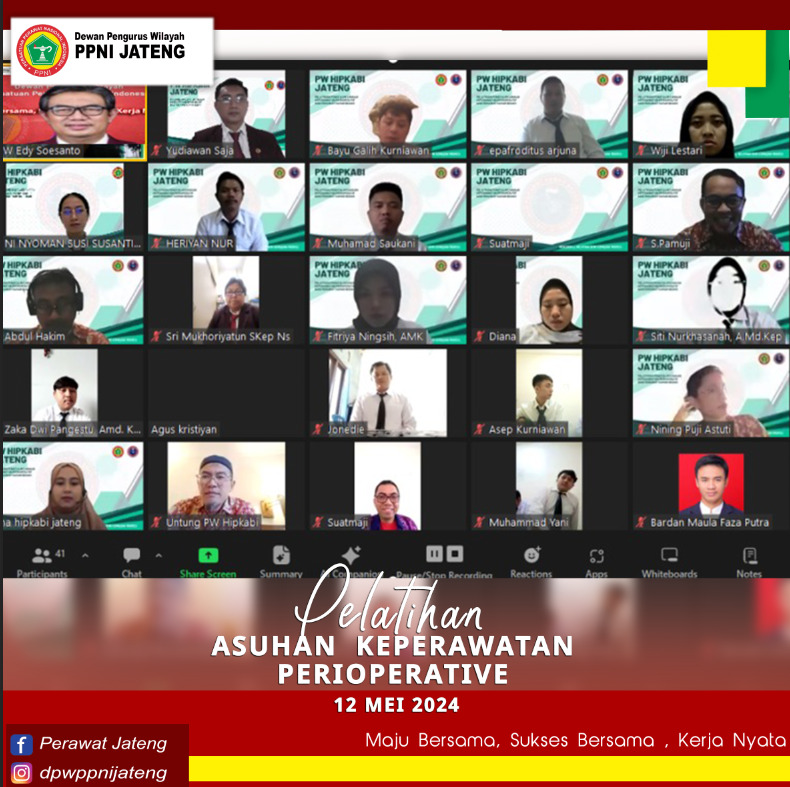 Sekretaris DPW PPNI Dr. Edy Soesanto,SKP , M.Kes membuka Pelatihan Asuhan Keperawatan Perioperative yang diselenggarakan Himpunan Perawat Kamar Bedah Indonesia [ HIPKABI] PW Jateng bersama Pusbangdiklat PPNI pada tanggal 12 mei 2024 bertepatan dengan peringatan Internasional Nurse Day 2024 . Dalam sambutannya Edy Soes menyampaikan layanan kamar operasi membutuhkan perawat yg bisa memberikan pelayanan operasional asuhan keperawatan perioperative dalam mendukung tranformasi layanan kesehatan di seluruh Indonesia. Kualitas SDM perawat di kamar bedah perlu terus ditingkatkan karena metode dan tehnologi layanan di kamar operasi terus maju dan semakin canggih.